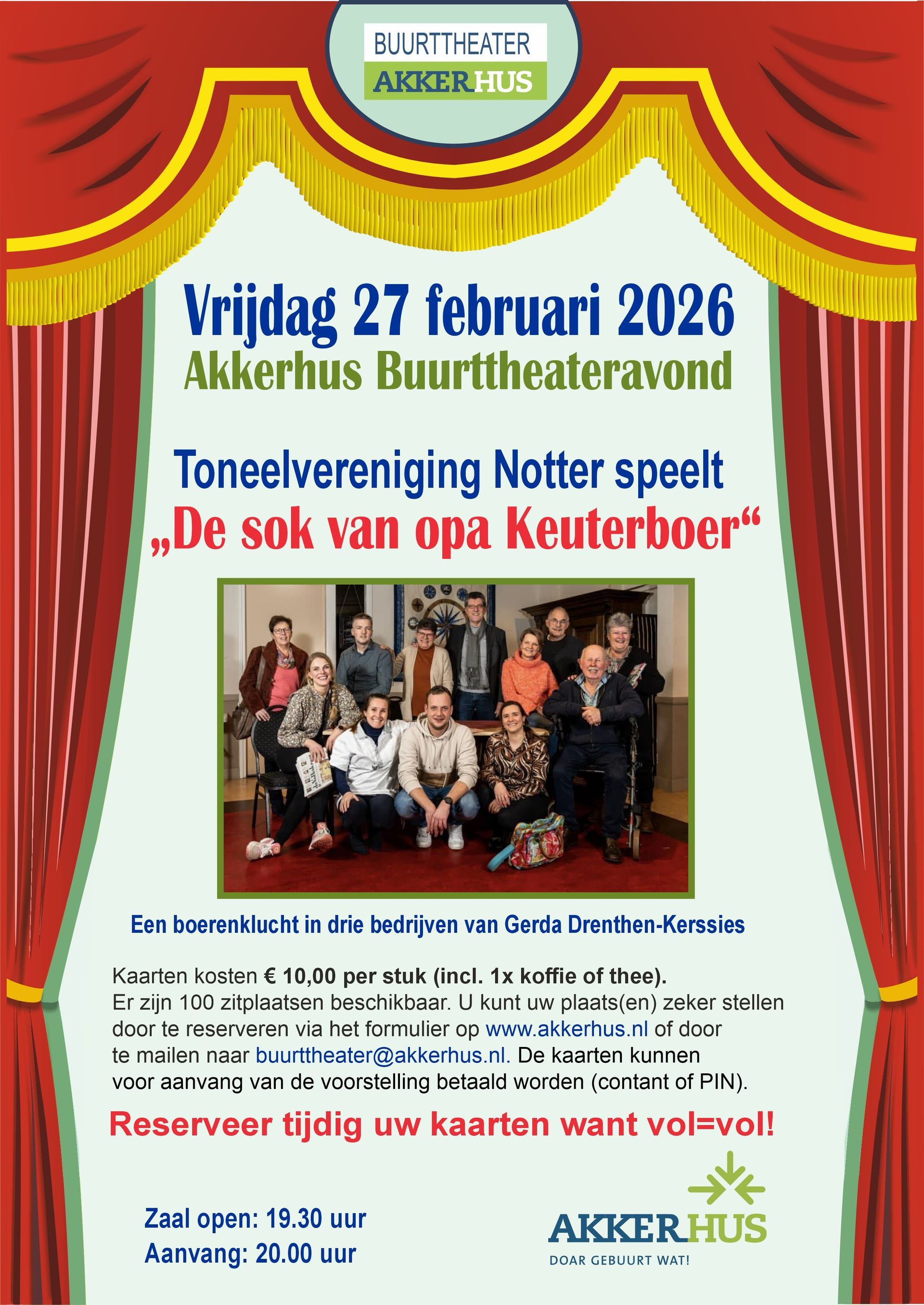 Er staat alweer een nieuwe Akkerhus Buurttheateravond gepland en wel op vrijdagavond 27 februari 2026.