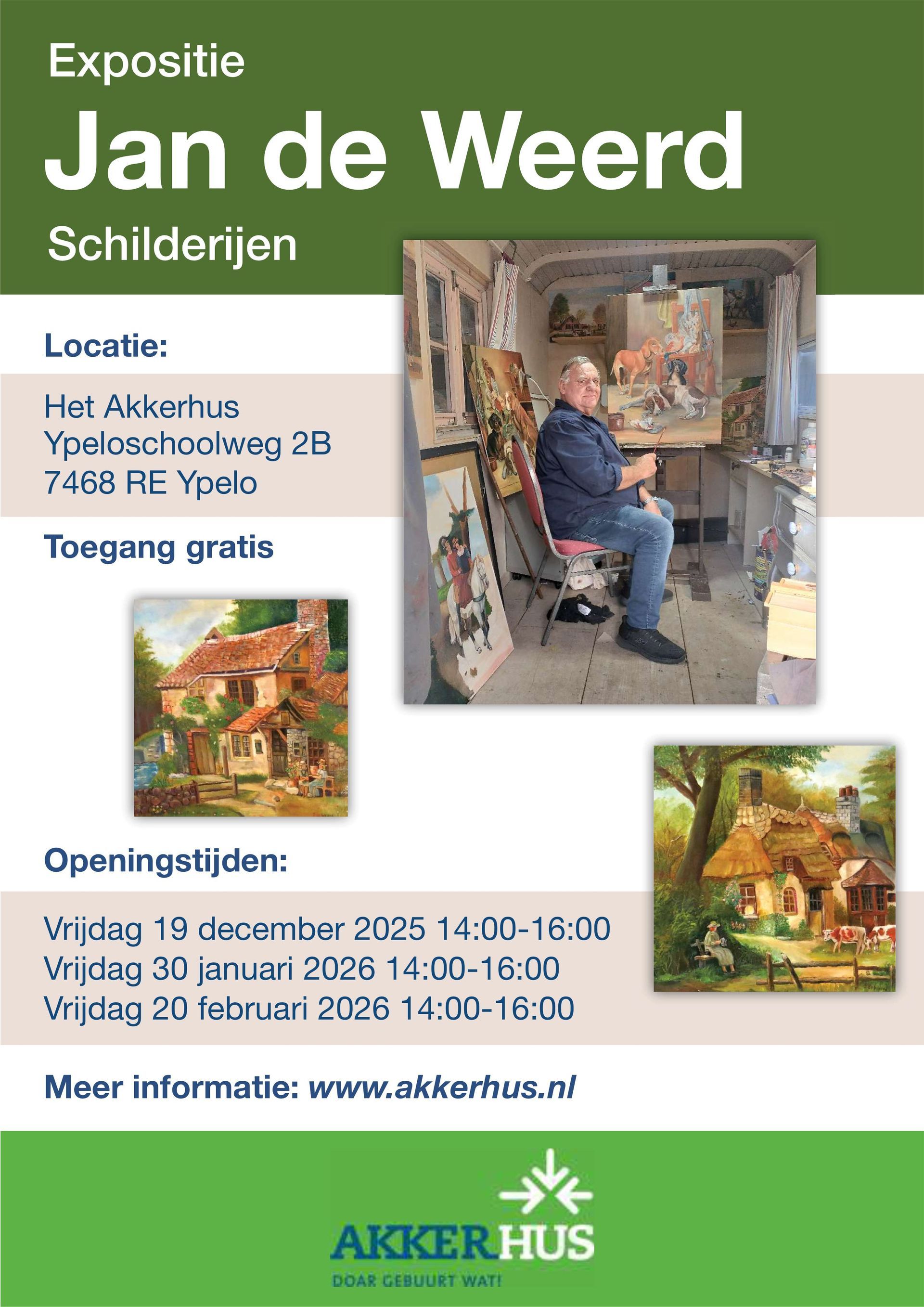 Vanaf december zijn er andere schilderijen te zien, namelijk van Jan de Weerd uit Rijssen. Jan is oud-Enternaar. Hij maakt kleurrijke olieverf schilderijen van herkenbare onderwerpen. De eerste openstelling voor deze expositie zal zijn op 19 december 2025. Van 14.00 tot 16.00 uur.